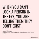 We have all averted our eyes from an uncomfortable site, which is probably something different for each and every one of us. But there is more to that thought than meets the eye. Seeing eye to eye doesn’t have to mean that we agree or understand everything a person stands for, rather, it could mean seeing and acknowledging the existence of he/she/they, regardless of their standing in life, their race or ethnicity, their religious beliefs, or their me-ness.