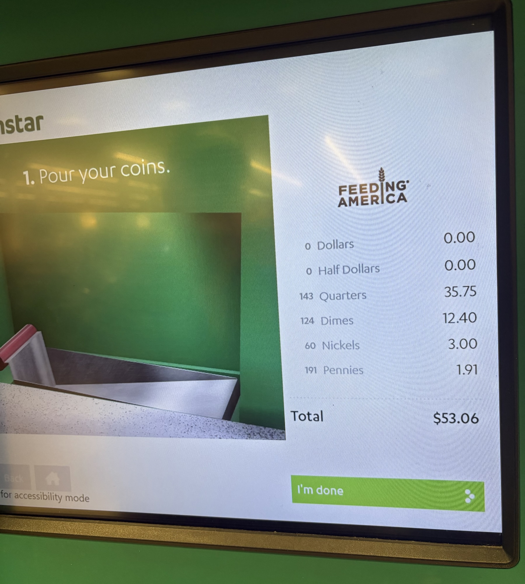 The other day, my husband and I decided to do something with that change that, quite frankly, was just collecting dust and tarnishing where it accumulated. We took the jar down to the nearest Coinstar kiosk, deciding that if there was a donation option for providing food to the needy, we would select that charity. BINGO! There was!!! This photo shows you what an accumulated $53.06 over the years was able to do for Feeding America, our chosen donation recipient. According to their website $1 = 20 meals so our spare change that we weren’t using equates to 1060 meals!!!