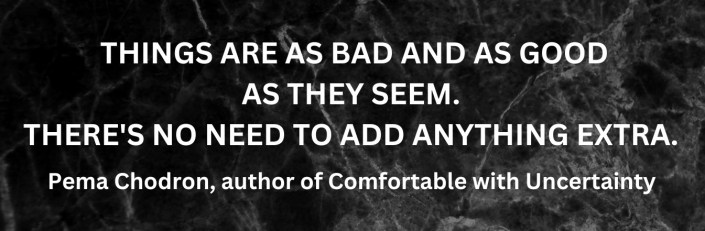ACCEPT THE POSITIVE AND THE NEGATIVE I don’t subscribe to the philosophy of think positive thoughts and all your worries will disappear. Nope, but what I do subscribe to is getting to a place of understanding that nothing is permanent…NOTHING. The bad times wane and, of course, so do the good times. For me, knowing that to be an incontrovertible fact helps me realize that my thoughts aren’t worth investing in. I enjoy the warm fuzzies that positive thoughts give me while trying not to assign too much weight to the negative thoughts that occur unbidden at the most inopportune times, like when I’m trying to fall asleep.