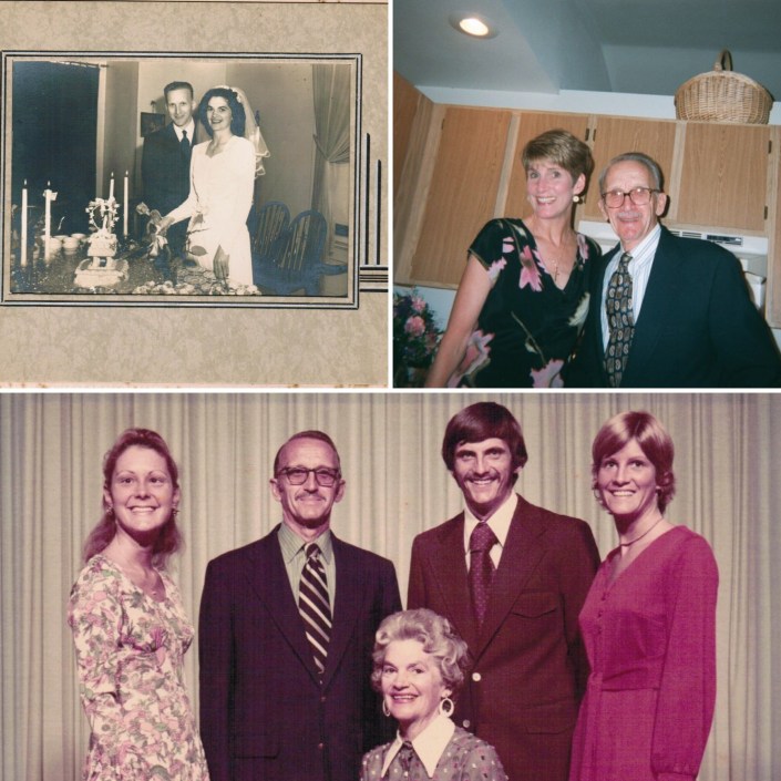 I will close this post by providing glimpses of my father to you over the years. I hope you enjoy this montage that includes, from top left: My mother and father’s wedding day, 1947; my wedding day 2000 (my favorite photo of my dad and I); and the Desonier family circa 1971.